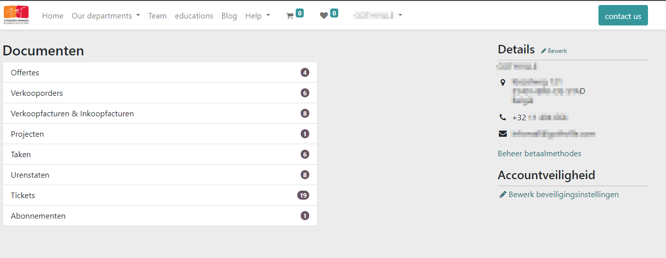 Wanneer u uw account pagina hebt geopend, krijg je links op je scherm een overzicht van de beschikbare documenten. En rechts de informatie van jezelf en/of van je bedrijf. Onder uw adres heb je een link naar je betaalgegevens, indien je deze hebt opgegeven. En hieronder heb je nog een onderdeel Accountveiligheid waar u uw wachtwoord kan aanpassen. We raden trouwens ook aan om uw 2FA (MFA) te activeren, ook hier is het voornaam dat u uw gebruiker veilig maakt om te verbinden.