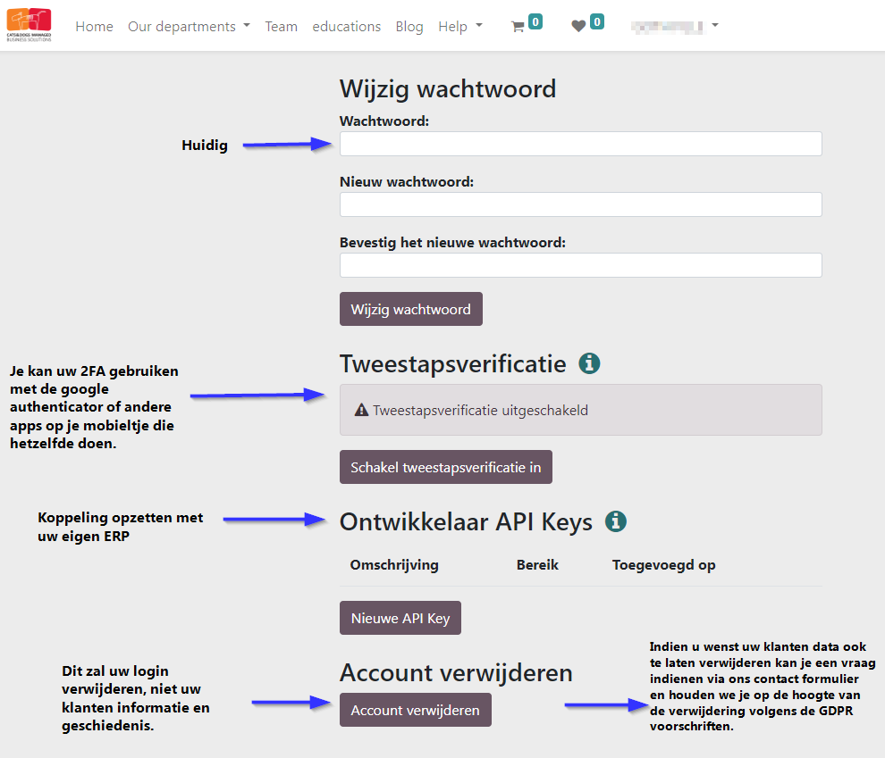 Je kan uw login zelf verwijderen. Let wel, we verwijderen hier uw toegang op ons portaal, we verwijderen niet uw geschiedenis of klantgegevens. Wanneer je van mening bent dat wij uw klantgegevens niet meer nodig hebben kan je die GDPR gewijs vragen om te verwijderen via het contact formulier op onze sites.