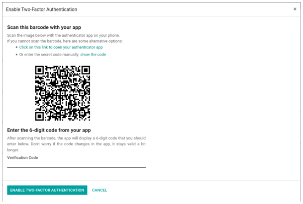 Wanneer je niet kunt scannen, kun je ook op de link klikken net boven de QR-code om de code te tonen. Je dient deze dan wel manueel in te geven in uw toepassing.